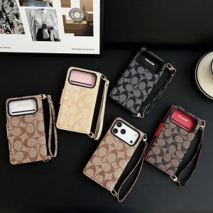 コーチ iPhone ケース モノグラム柄 ストラップ付き 落下防止 カードポケット付き