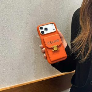 セリーヌ iPhone ケース カード収納 ミラー付き 背面収納 高級感 オレンジ MagSafe対応