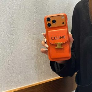 セリーヌ iPhone ケース カード収納 ミラー付き 背面収納 高級感 オレンジ MagSafe対応