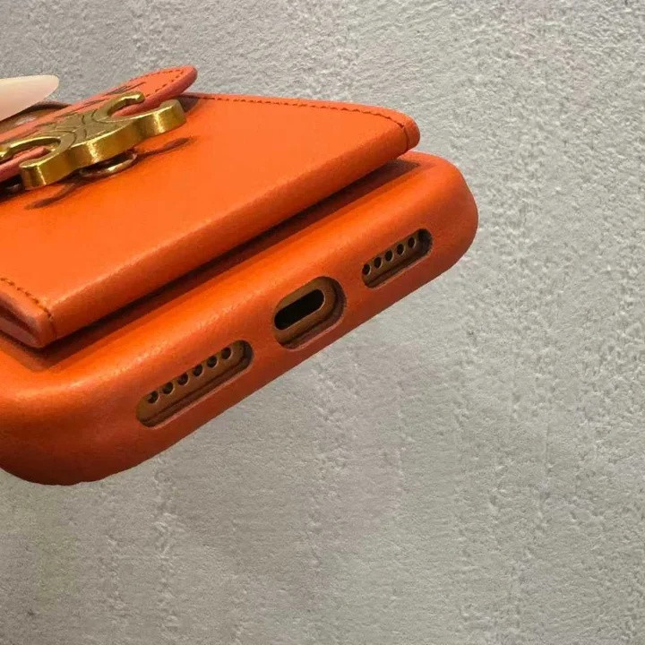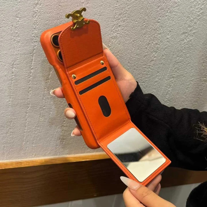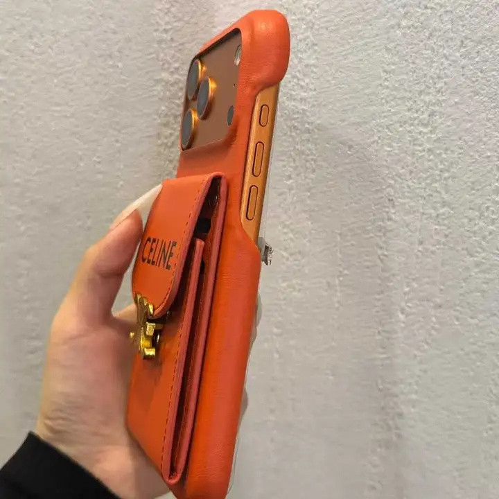 セリーヌ iPhone ケース カード収納 ミラー付き 背面収納 高級感 オレンジ MagSafe対応個