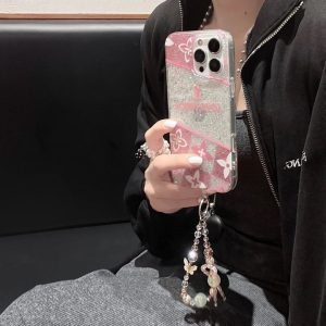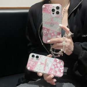 ルイ?ヴィトン iPhone ケース ピンク チェック柄 グリッター キラキラ ストラップ付き